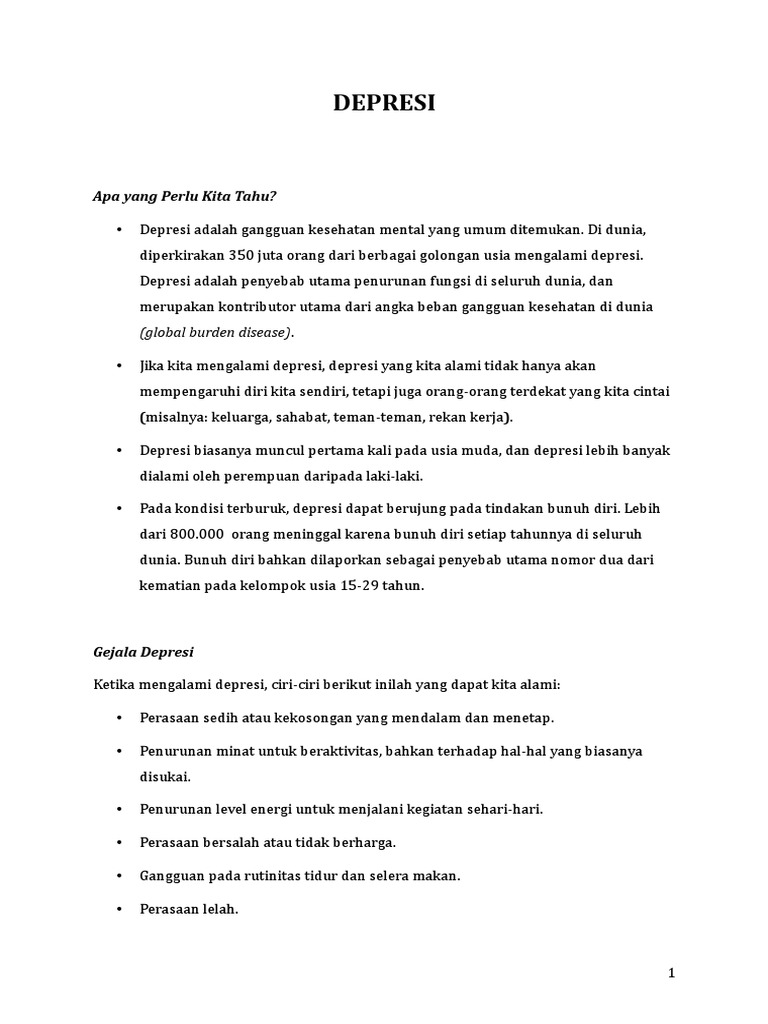 Depresi adalah gangguan mental yang berbeda dengan stres dan tidak boleh disepelekan. Ini adalah gangguan mood atau emosi seseorang; Depresi adalah penyakit dengan banyak penyebab dan banyak bentuk. Depresi adalah salah satu penyakit mental yang paling umum terjadi di masyarakat. Tetapi penjelasan itu tidak cukup untuk menjelaskan penyebab dari gangguan mental yang rumit ini. Secara umum, ketika berbicara tentang depresi besar, orang cenderung melihatnya sebagai peristiwa ekonomi amerika. Itu bukan sikap bahwa seseorang dapat mengendalikan atau keluar dari. Dalam dunia medis, depresi diistilahkan sebagai clinical depression (depresi kesedihan dalam diri penderita depresi umumnya diikuti dengan sejumlah perasaan buruk lainnya. Berbagai penyebab depresi di atas adalah penyebab yang biasanya ditemui pada orang dewasa. Banyak usaha untuk mengetahui penyebab dari. Sebenarnya, apa yang dimaksud dengan depresi? Namun, tidak ada penyebab pasti dari depresi. (baca bila penyebab fisik untuk depresi dapat disingkirkan maka berikutnya adalah pemeriksaan psikiologis.